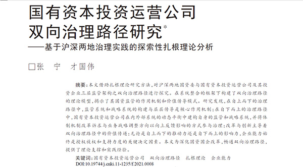 近期,前海金控博士后創(chuàng)新實踐基地博士后張寧與中山大學(xué)嶺南學(xué)院才國偉教授在中國社會科學(xué)院評定的管理學(xué)唯一頂級期刊《管理世界》2021年第1期合作發(fā)表論文,這標志著我司博士后的學(xué)術(shù)研究水平邁上新臺階。《國有資本投資運營公司雙向治理路徑研究——基于滬深兩地治理實踐的探索性扎根理論分析》一文為深化國資國企改革、暢通雙向治理路徑提供了理論支撐和實踐經(jīng)驗參考。