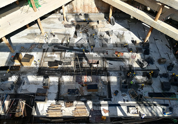 此次首塊澆筑底板位于地塊北區(qū),基底地質(zhì)條件復(fù)雜,土質(zhì)含水率較高,施工條件較差。經(jīng)過前期暗埋排水、設(shè)置集水井等措施,有效降低了土質(zhì)含水量,克服了多工種同時(shí)作業(yè)的不利影響。經(jīng)過33小時(shí)的連續(xù)奮戰(zhàn),進(jìn)場(chǎng)罐車達(dá)342車次,共計(jì)澆筑混凝土2733m³,最終打贏了這場(chǎng)攻堅(jiān)戰(zhàn)。